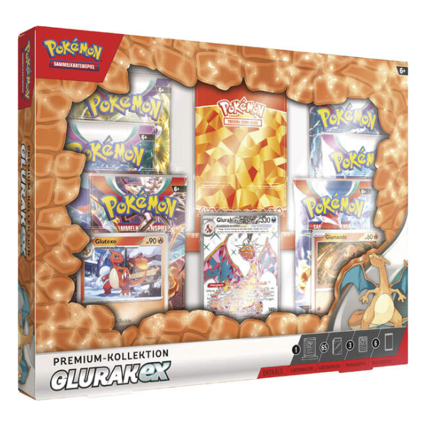 Die Premium-Kollektion Glurak-ex des Pokémon-Sammelkartenspiels enthält: