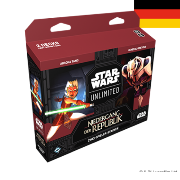 - Im Zwei-Spieler-Starterset für das dritte Set des Spiels, Twilight of the Republic, finden Sie zwei vollständig aufgebaute, spielbereite Decks, in die Sie und ein Freund eintauchen und mit dem Erlernen des Spiels beginnen können. Führen Sie als Ahsoka Tano einen koordinierten Angriff oder befehligen Sie als General Grievous Droidenarmeen!